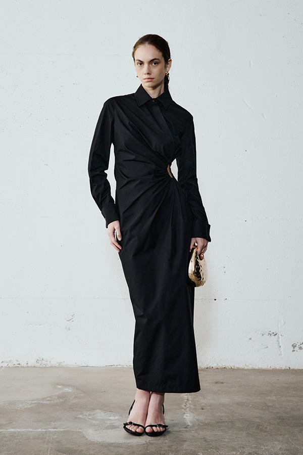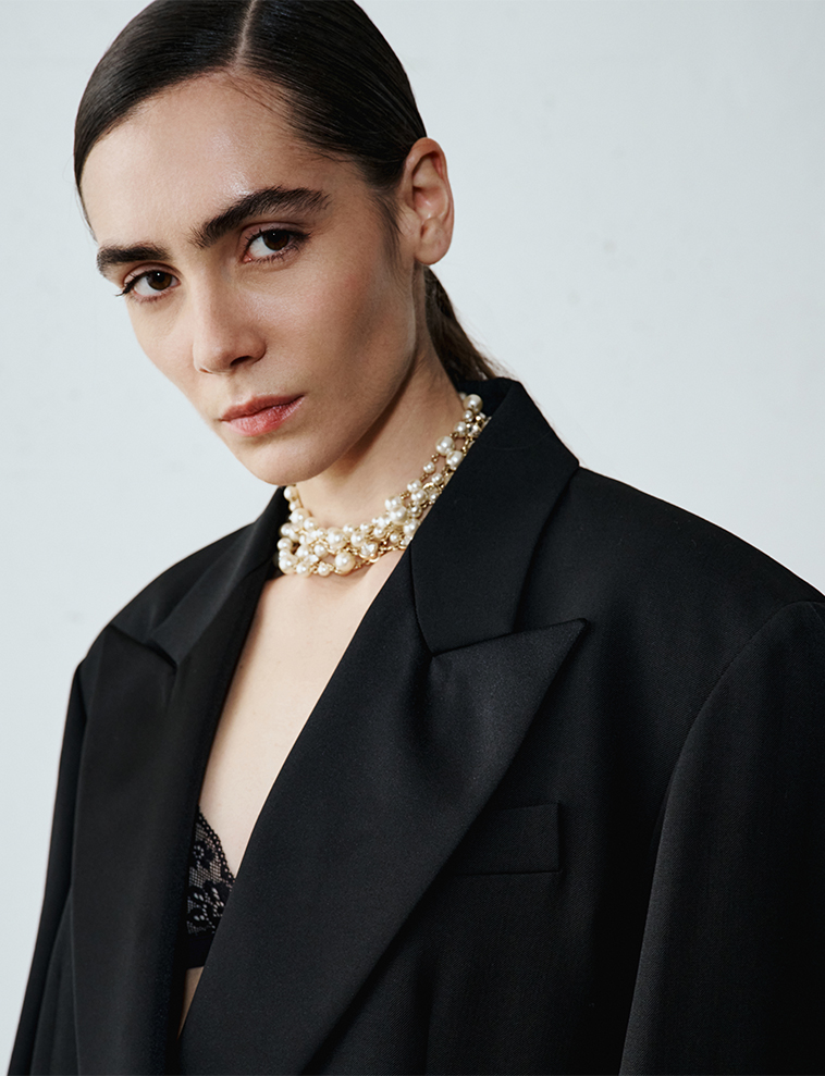 Elegance begins again with black: discover flowing silhouettes and cut-out details. From tailored suits with satin lapels to draped dresses, every look shines thanks to highlights and pearl necklaces. Impeccable tailoring and jewel accessories for an unforgettable evening.