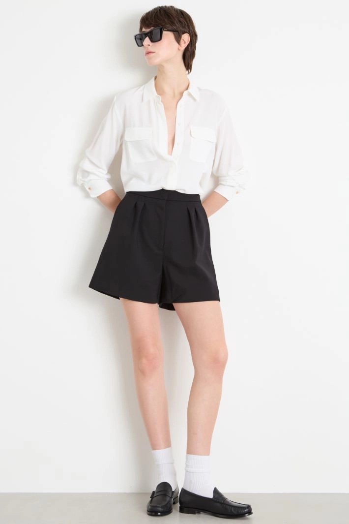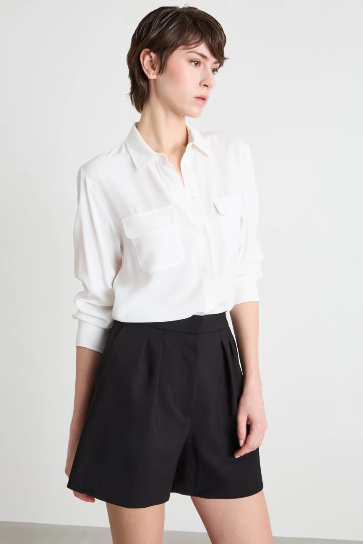 Straight-cut blouse crafted in silk-blend crepe de chine, featuring a pointed collar, patch pockets on the chest and long sleeves. Concealed button fastening.