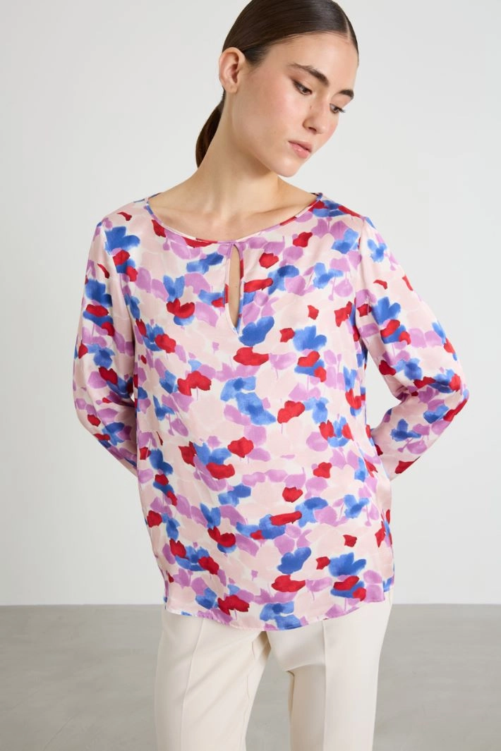 Loose-fit blouse in pure viscose, boat neckline with teardrop opening on the front and long sleeves with gathered cuffs and buttons.