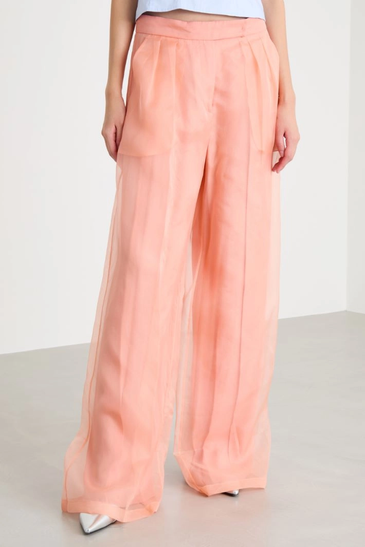 Wide-leg palazzo trousers crafted in pure silk organza. This lined piece features double pleats and French pockets at the front, with welt pockets at the back. Concealed zip fly and hook fastening.