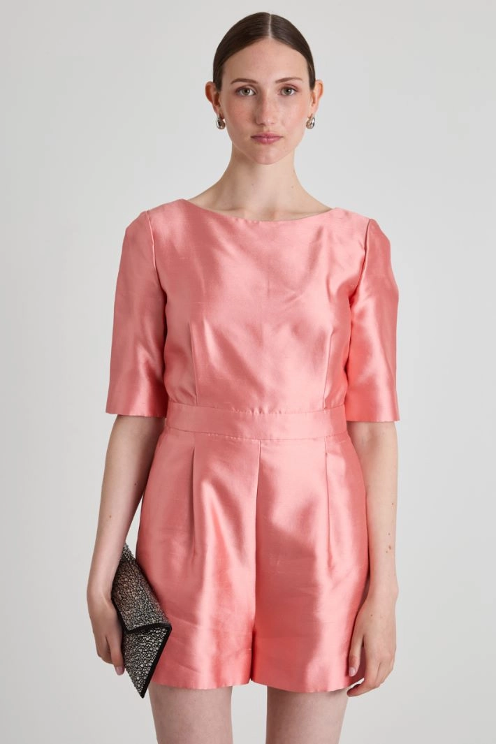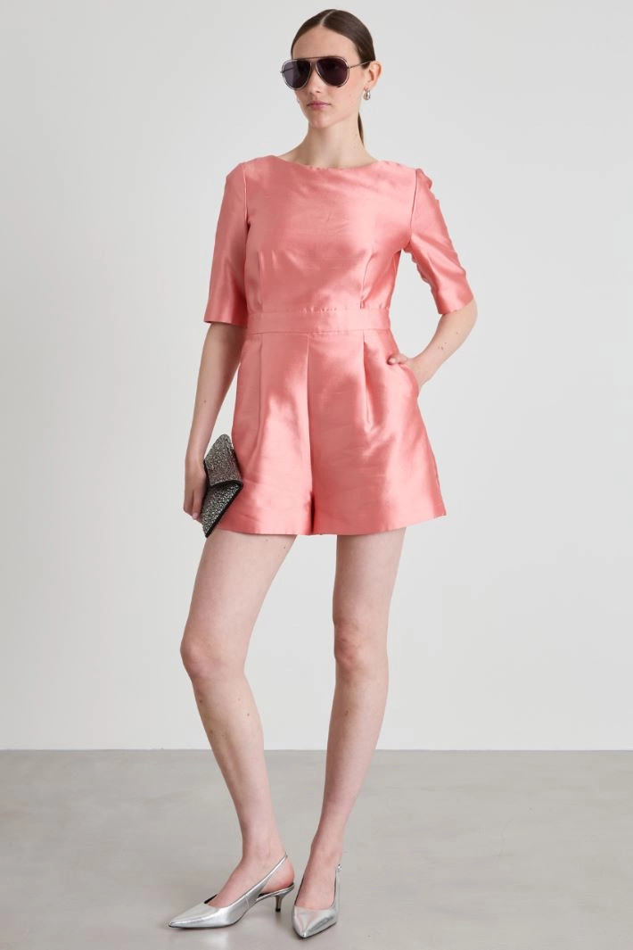 Straight-fit silk and cotton shantung with a boat neckline, short sleeves, darts sewn at the waist and French side pockets. Model with thin crossed ribbons on the back and invisible zip fastening on the back. Partially-lined.