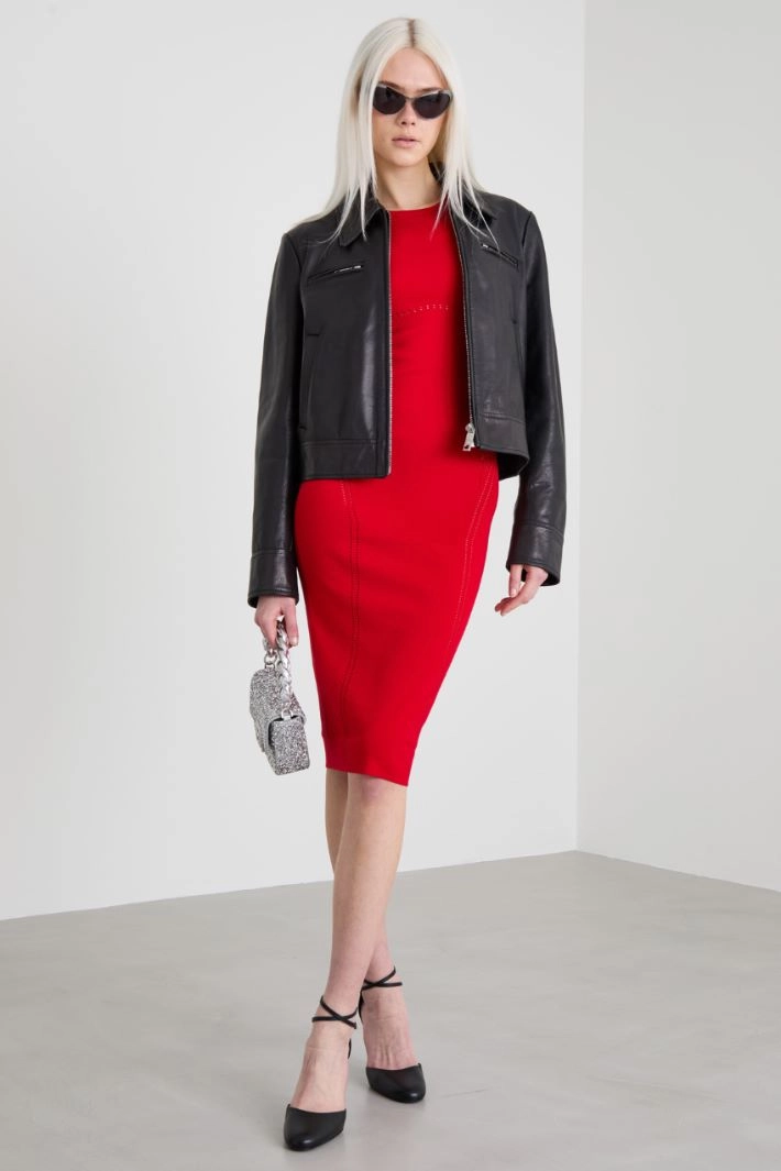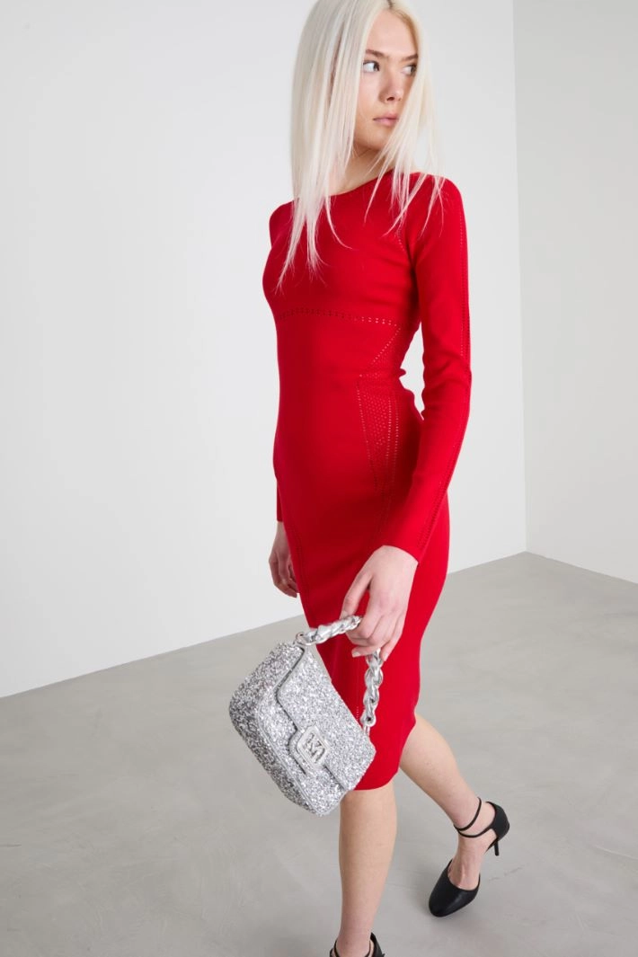 Fitted midi dress in viscose blend knit, with openwork design, round neckline and long sleeves.