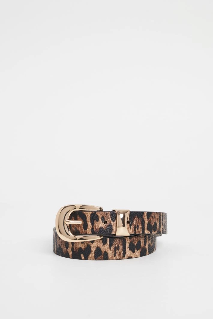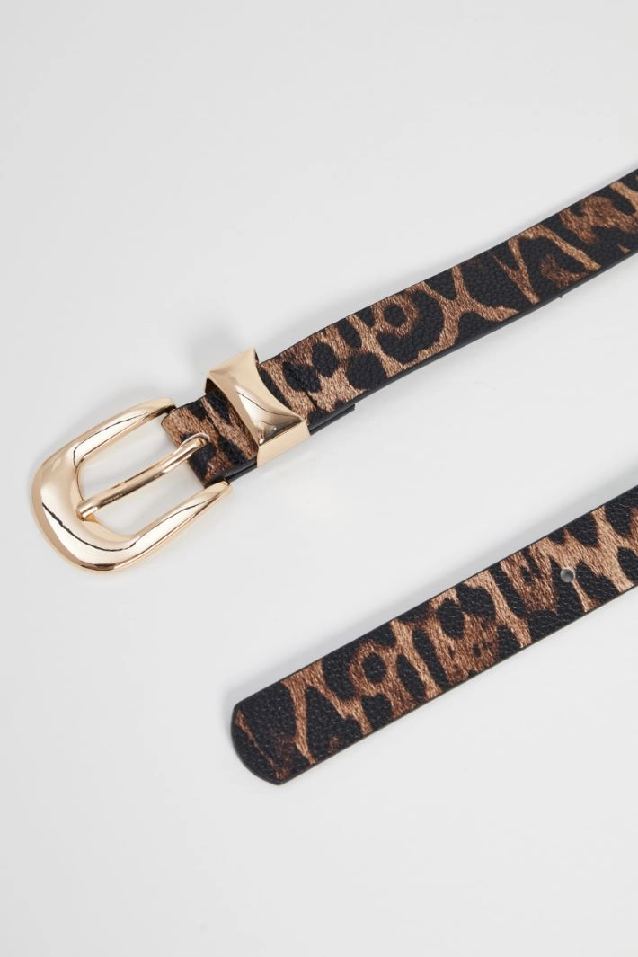 Belt in animal-printed faux leather, with single loop, rounded buckle and metal pin.