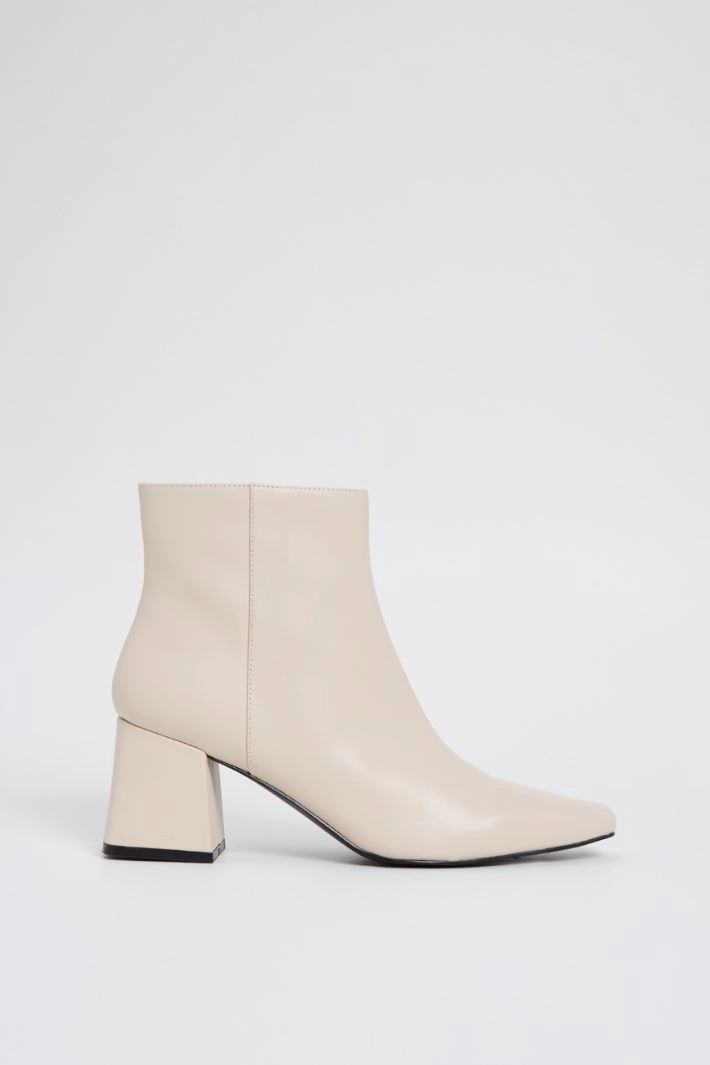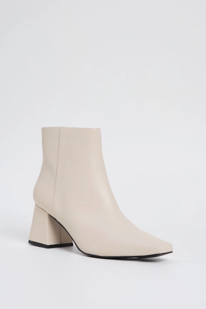 Ankle boots in genuine leather with a shiny finish, square toe and trapezoid heel. Zip on the inside and rubber sole.