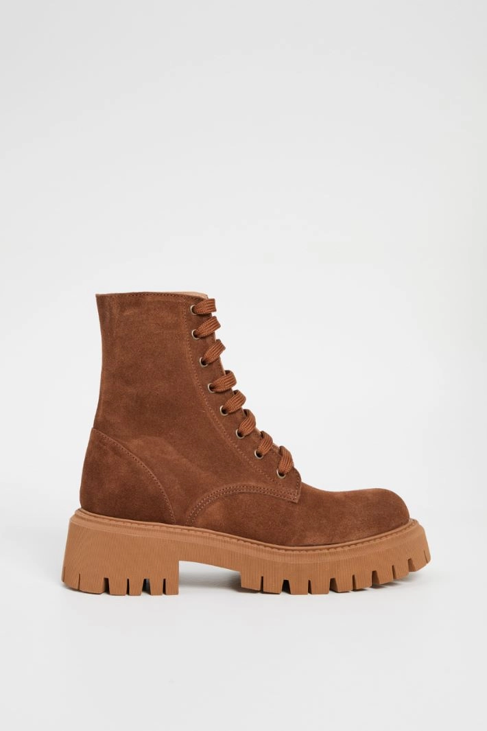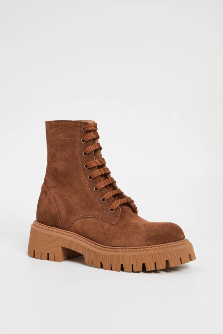 Ankle boots in genuine suede leather. with rounded toe and lace-up closure. Leather lining and rubber trekking sole.