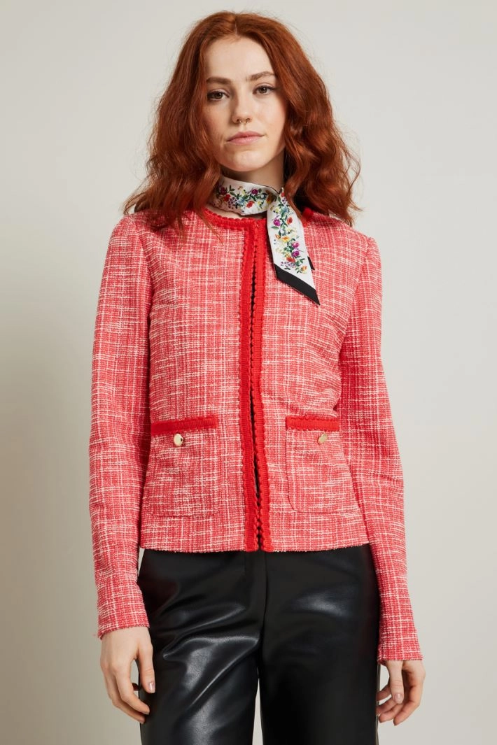 Straight-cut jacket in stretch jacquard cotton-blend tweed jersey, with crew neck, long sleeves, side patch pockets with button and trims finished with matching trimmings. Single-breasted fastening with hooks. Unlined.