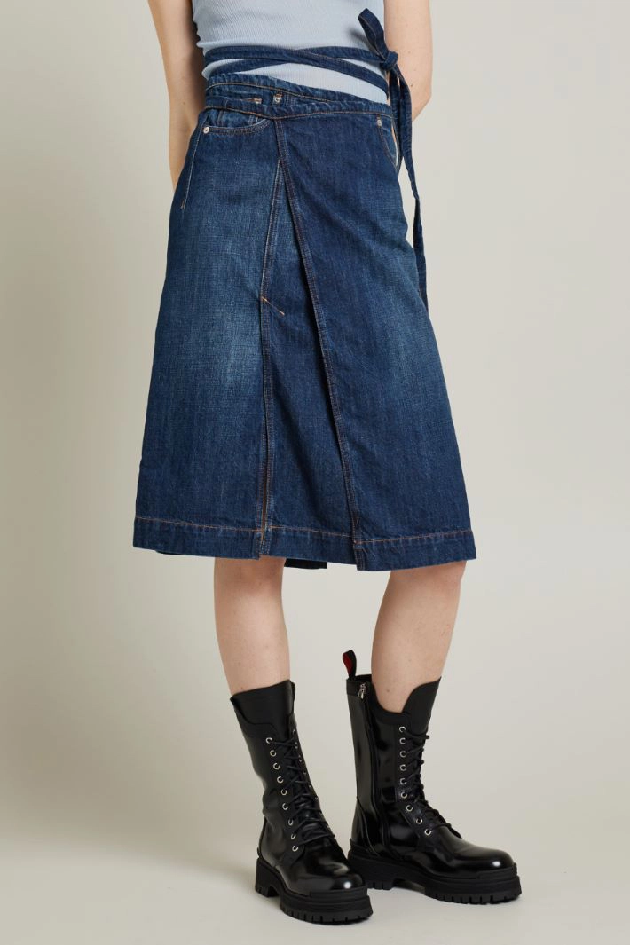 Flared midi wrap skirt in pure cotton denim, with five pockets, overlapping slits at the bottom and crossover fastening with a button and ribbons to tie at the waist.