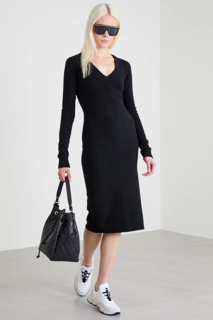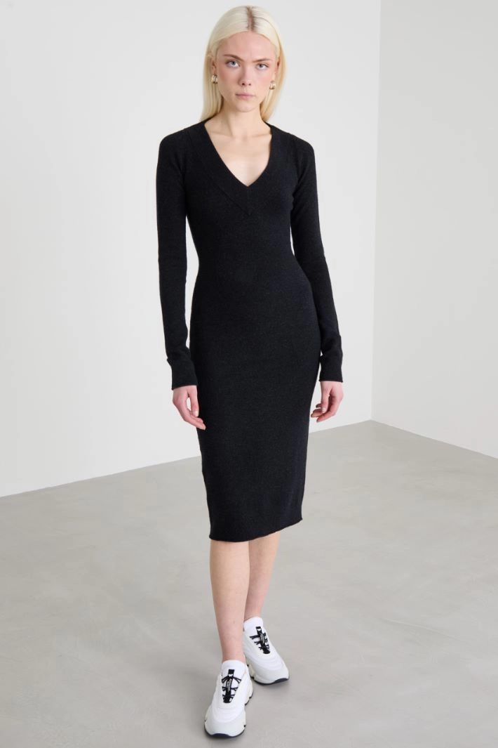 Fitted dress in wool and cashmere blend, with a V-neck, long sleeves and ribbed trims.