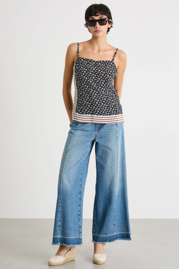 Slim-fit top in printed pure silk crepe de chine, featuring a straight neckline, slender straps, and a contrasting panel at the hem. Side zip fastening.