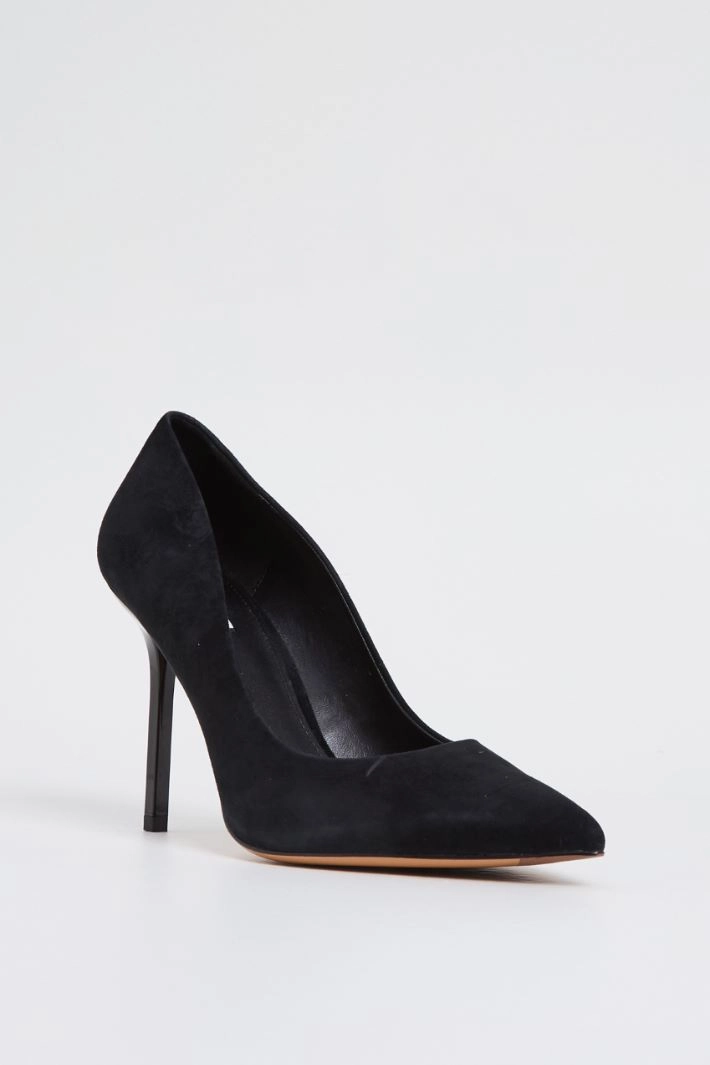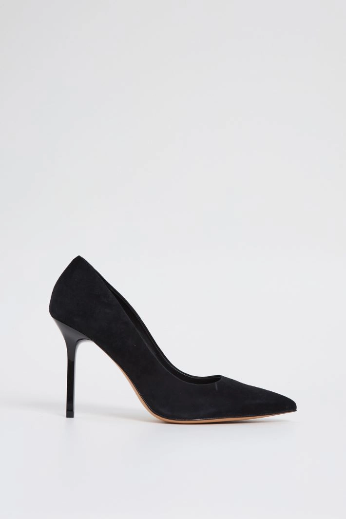 Court shoes in genuine suede-effect leather, with a pointed toe and a thin lacquered heel. Leather lining, leather sole.