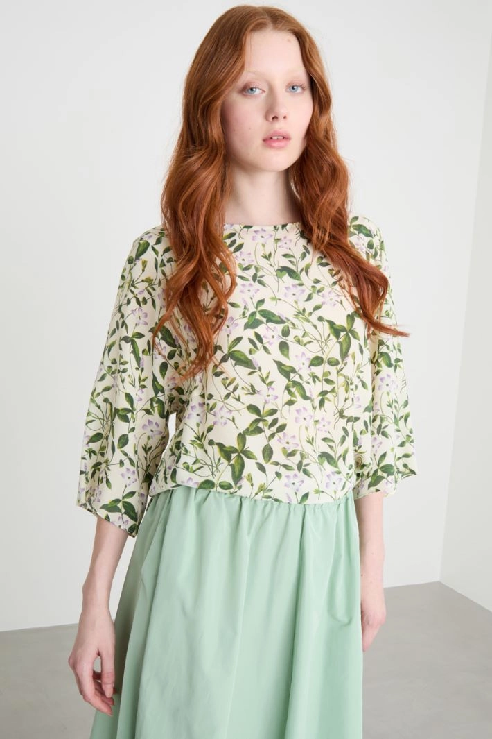 Loose-fit blouse in printed pure silk twill, with a round neckline, dropped shoulders and three-quarter sleeves, and an inverted pleat on the back. Keyhole fastening with a button at the back.