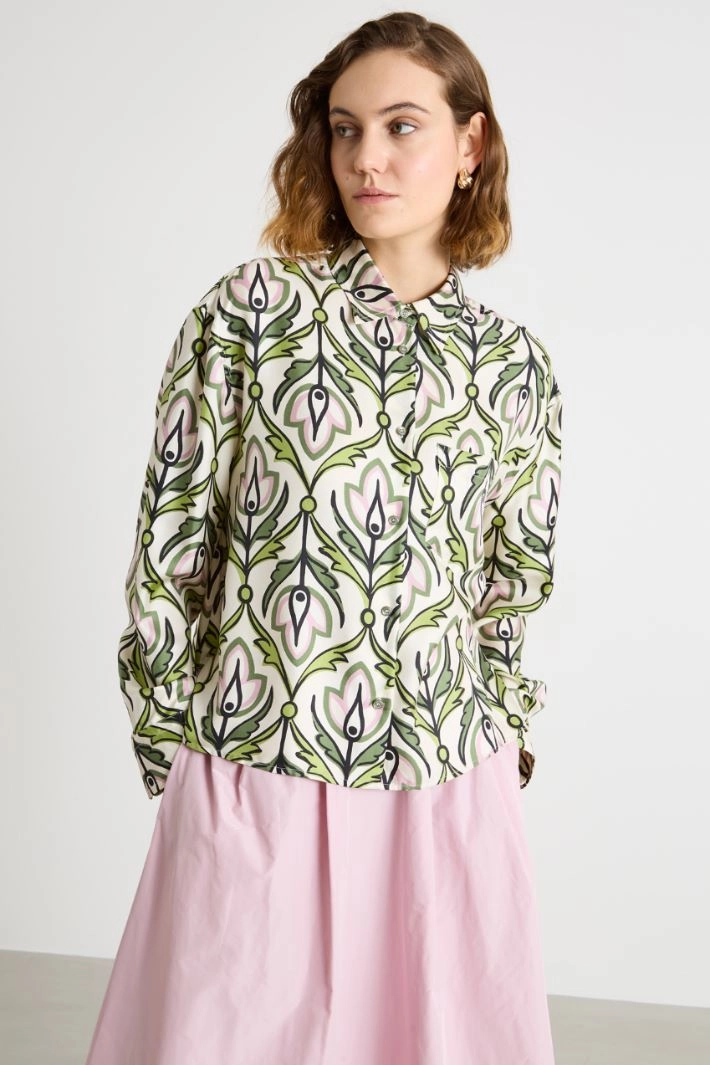 Boxy-fit blouse in pure silk twill, with a pointed collar, a patch pocket on the chest, long sleeves with buttoned cuffs, side slits and a yoke with a pleat on the back. Button fastening.