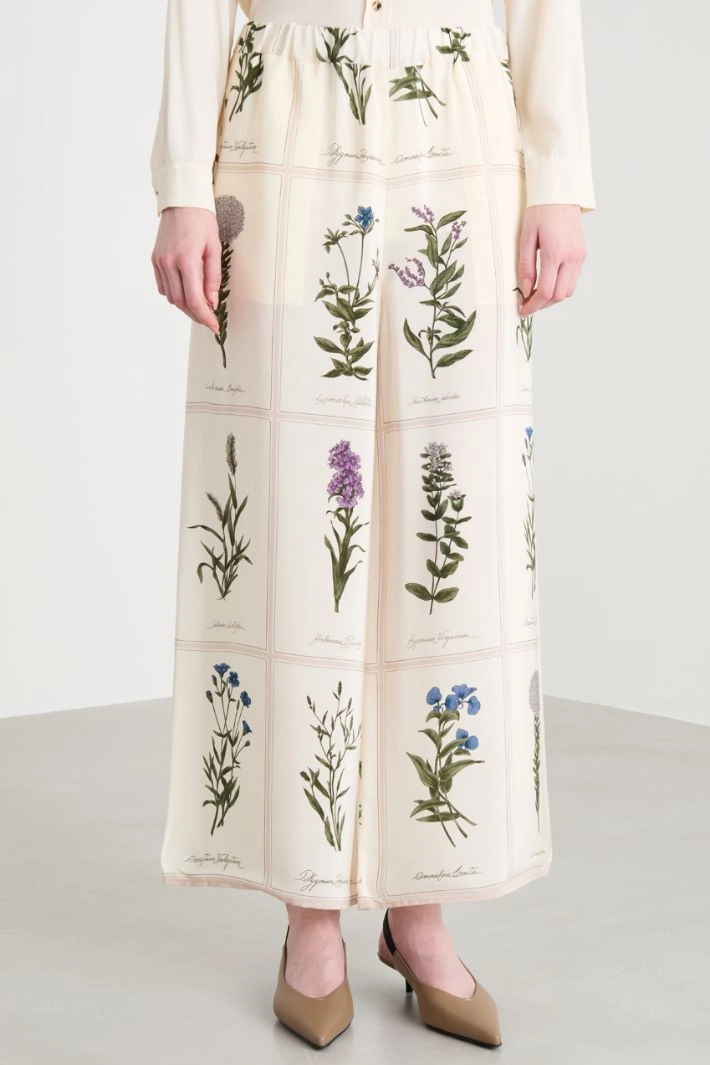 Flowing trousers in printed pure silk crepe de chine, with an elasticated waist and in-seam pockets.