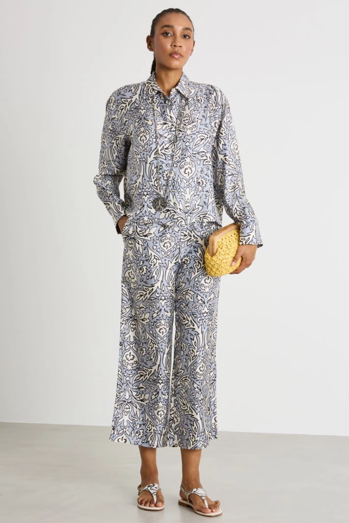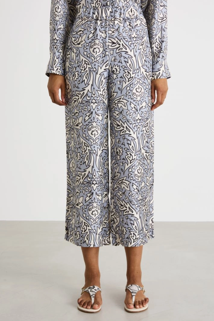 Wide-leg trousers crafted in printed silk twill, featuring an elasticated waist and French pockets.