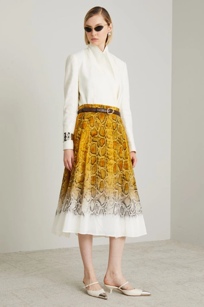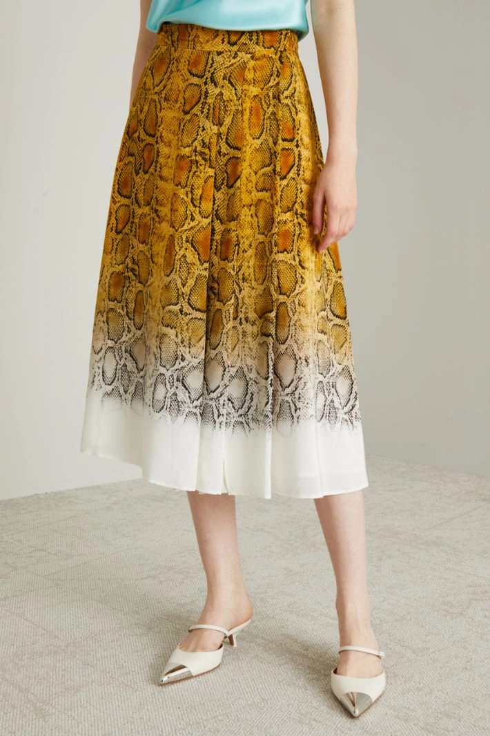 Flared wrap skirt in pure silk crepe de chine with an animal print, featuring a stitched pleat motif and a slit motif on the back. Crossed fastening with buttons. Lined.