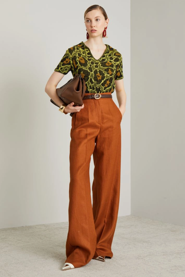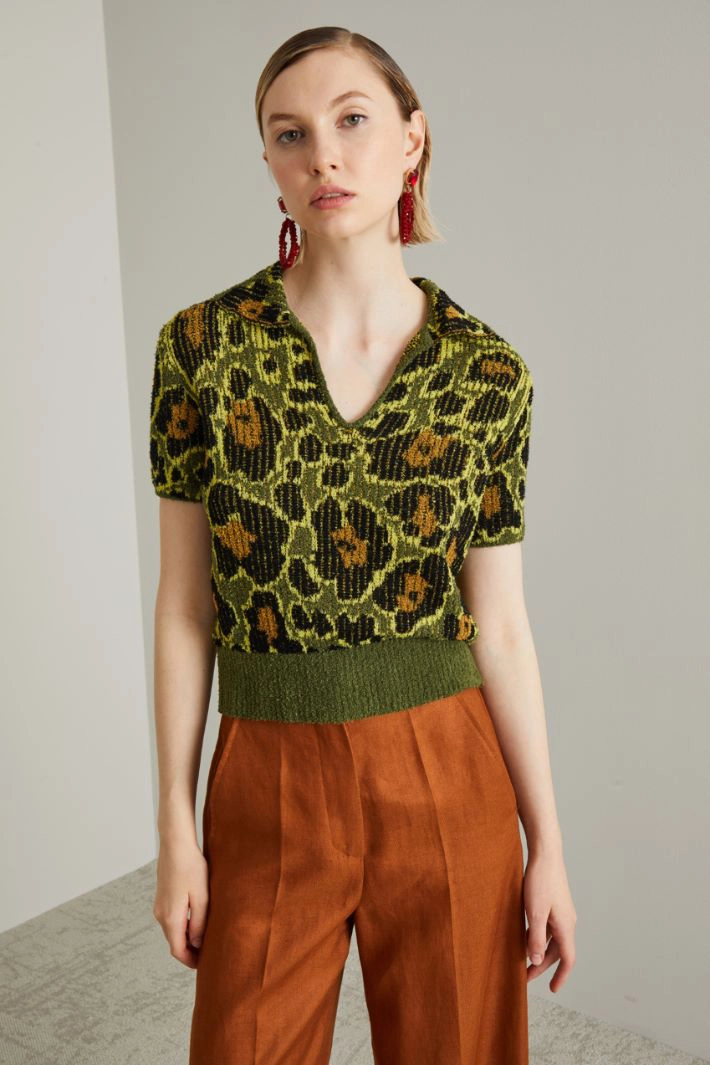 Slim-fit polo shirt in jacquard cotton-blend bouclé yarn, with flat collar, V-neck opening at the front and short sleeves.