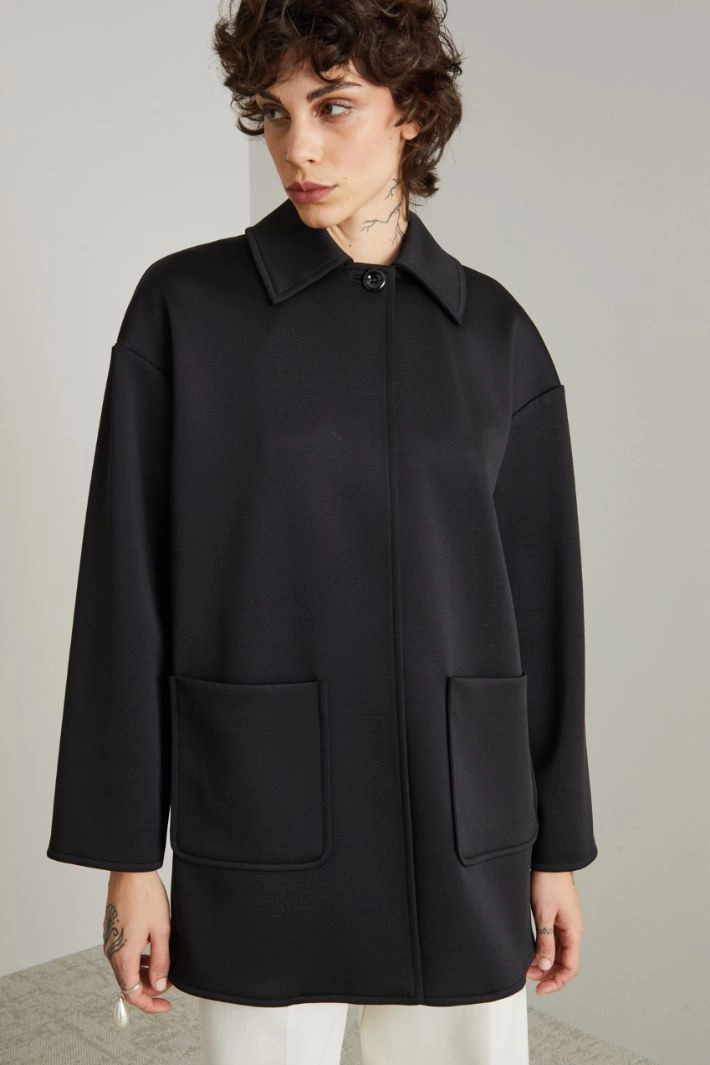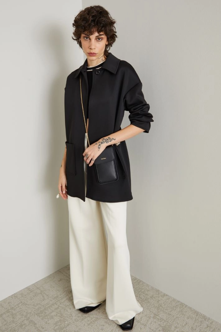 Single-breasted, wrap jacket in compact jersey with a shirt collar, long dropped sleeves, front patch pockets, a matching belt fastening in the same tone and a single button at the collar. Unlined.