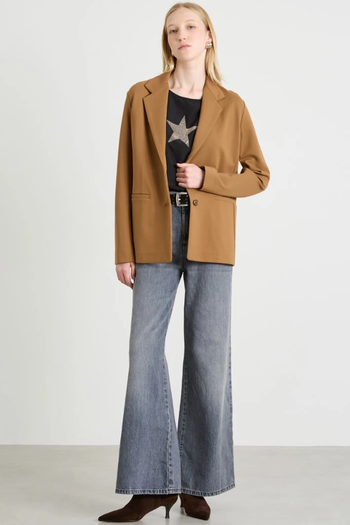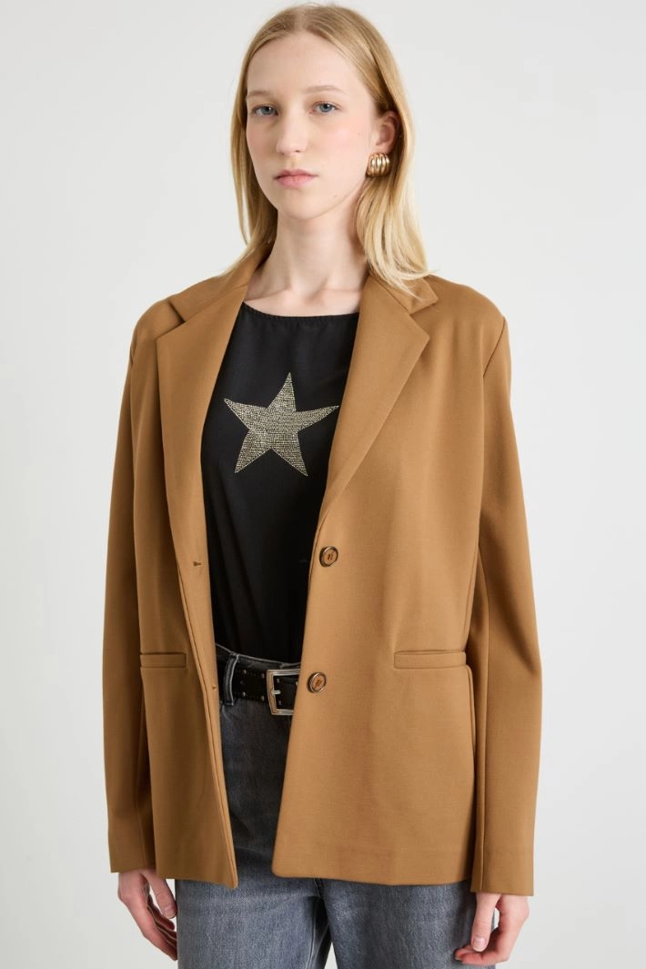 Slightly fitted blazer in stretch viscose blend jersey, with lapel collar, long sleeves, side welt pockets and central vent on the back. Single-breasted button fastening. Unlined.