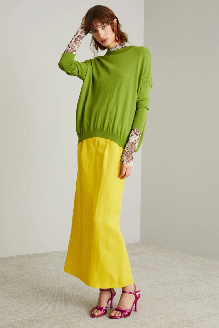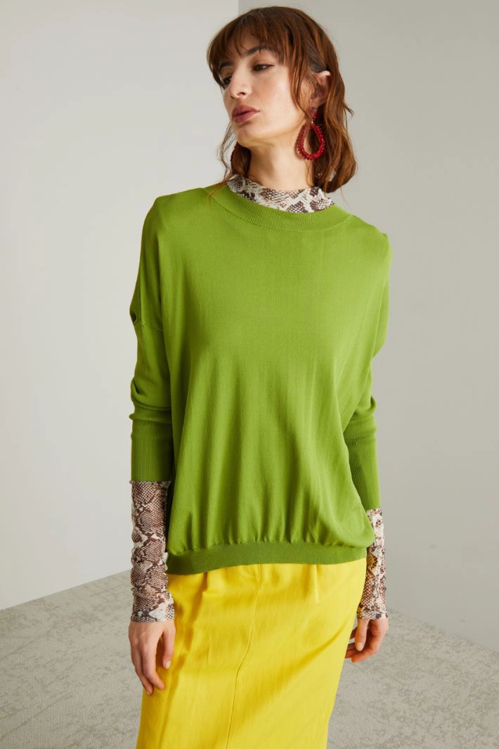Oversized sweater in viscose blend crepe yarn, with a boat neckline, long dropped sleeves and ribbed trims.