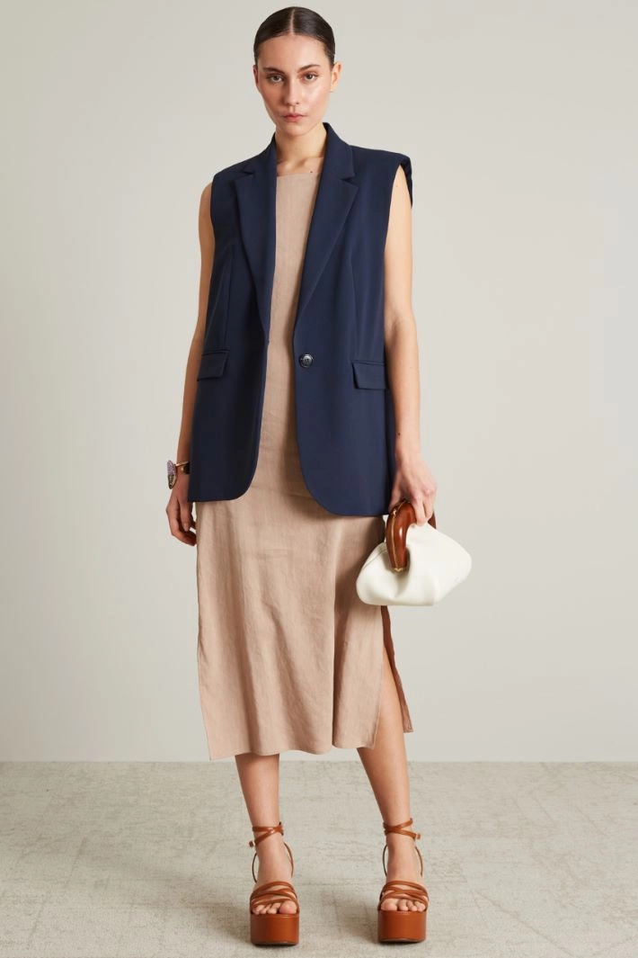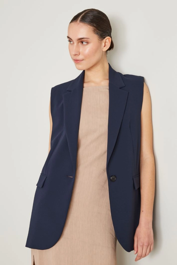 Straight-fit gilet in crepe fabric, with lapel collar, double-welt side pockets with flap, central vent on the back and single-breasted fastening with button. Lined.