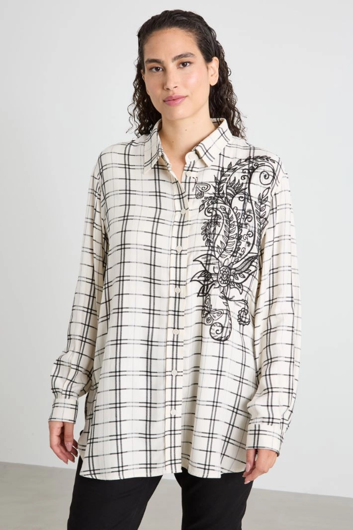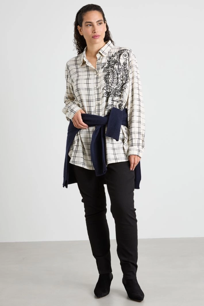 Straight-fit shirt in flowing viscose fabric with a classic collar, long sleeves with buttoned cuffs, a back yoke with a box pleat, and a rounded hem. Button fastening.