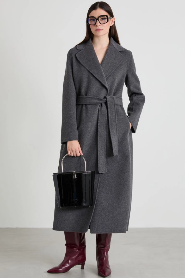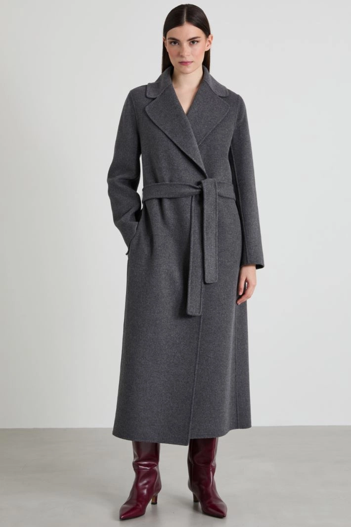 Straight-fit coat in double pure wool drap, with lapel collar, long sleeves, inset side pockets and central slit on the back. Matching belt.